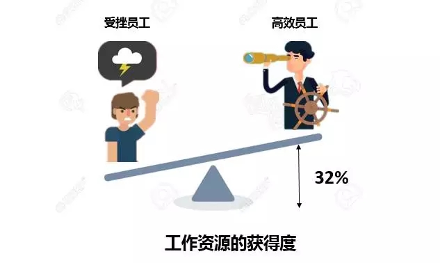 为了进一步找到员工受挫的原因,结合光辉合益大量员工数据,我们把受挫的员工和高效的员工做了对比,发现在资源,个人发展,培训,授权等方面,受挫的员工和高效员工的反馈明显不同。这也帮我们指明了员工受挫的常见原因:
