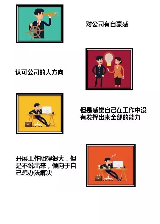 而目前受挫员工是企业不需要投入大量资源就可以提升业绩的理想人群,这个群体对工作热情,对公司有自豪感,只是缺少公司的支持而已。所以对管理者而言,及时发现自己团队这种“受挫”信号,尽快改善就变得非常关键。我们的研究表明,员工受挫的常见信号如下: