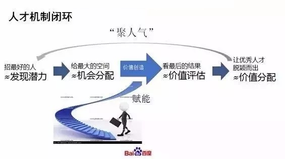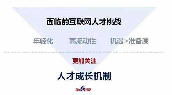 而站在互联网尤其像百度,我感觉人才矛盾点更多集中在高大上那边的事情,也就实说我们其实更多会去看人才成长机制。进入互联网时代人才竞争非常激烈,在两三年前我们创始人CEO跟我们说,他说资本的话语权在让位于知本,从capitalism 转向 talentism。这个词我们的感受还是很深刻的,如果一些比较厉害的人能够为你所用,其实给公司和社会带来的价值是非常大的,这是刚才说比较高大上的部分。