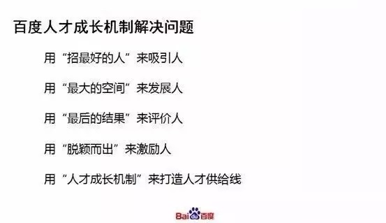在这种状况下总会流动,总会准备不好,我们最关注怎么运用人才成长机制,用人才成长机制解决问题是我们非常关心的。具体来讲,在百度我们人才成长机制有四句话,就是招最好的人、给最大的空间、看最后的结果、让优秀人才脱颖而出。