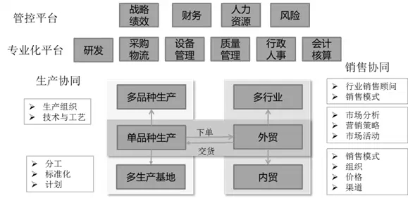 集团化企业的生产逻辑很清晰。以某家公司为例,最初只经营一个产品,只为国外某一行业服务,其组织形态完全符合波特模型。随着业务扩大,产品品种增多,生产基地也在增加。与此同时,又开拓了国内等诸多市场,服务对象也拓展为诸多行业。由此就产生了生产、销售、研发等创造性活动本身的协同问题,由此而产生采购、物流等辅助性活动的协同问题,以及财务、人力、计划等支持性活动协同问题。同时,还产生了效率与风险、质量与速度、计划与应变等的新的协同问题。