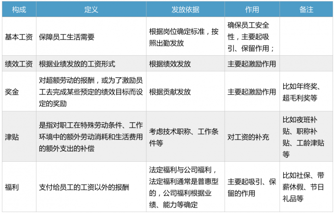薪酬构成是指薪酬总额中包含那些部分,营业员薪酬通常会包括几个部分:基本工资、绩效工资、奖金、津补贴、福利等。薪酬不同构成部分的发放依据、所起作用是不同的,具体见下表: