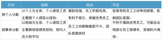 在实际操作中,也可将两者进行有机结合,比如,按个人分配的企业,可以拿出一定比例(比如20%)进行二次分配,二次分配关注日常工作的配合、店内公共事务履行等;按集体分配的,也可以拿出一定比例根据个人目标完成差异进行区分。