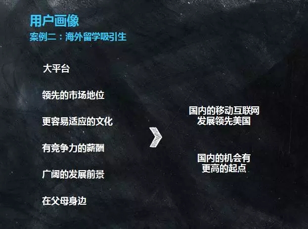 我们做海外招聘的时候要定义我们的用户,尤其是硕士的留学生为主,马上毕业的希望他们回国,他们的诉求是什么,以及我们能提供给他们什么,最开始梳理了这些东西,这些也是大家在做海外相关宣传的时候最常提到的一些东西,比如我们有大平台、有领先的市场地位,我们国内有更容易适应的文化,我们的薪酬也不错,我们有广阔的发展空间,而且你回国你还可以陪伴父母等等,我们大概对海外学生做传播的时候万变不离其宗,基本上跳不出这些框架,我们发现这些文案的效果并不好,问题出在哪儿呢?这难道不是用户需求吗?但是感觉我们挖掘偏了,所以我们做了一些更深的访谈。