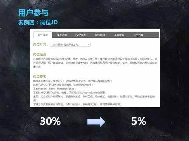 用户参与这件事情其实很简单,我相信每个人都在做的,因为可能要监控一些舆情,要回答一些同学的问题。我觉得这件事情就是把它持续做的更深入,以及心态更开放一些,更站在学生的角度去思考就好了。比如我们在全国大概有30多个目标院校,绝大多数是985院校,我们会在所有的目标院校里都建一个微信群,学生自愿加入,有一个整体的运营团队去运营,并在所有的群里安插我们的HR或者HR的“爪牙”,我们要深入每一个微信群了解学生说了什么,如果说的是有用的会及时反馈到这里做整个战略上的调整。