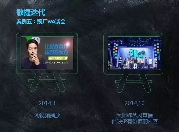 我们再改,嘉宾还是这些嘉宾,内容还是这些内容,我们换一个形式,我们不做《焦点访谈》这样的东西了,我们做成《康熙来了》,所以这就是现在的“鹅厂WO谈会”的雏形,在2015年10月上线得到整体90%以上的正面评价,我们在2016年把形式和内容进一步的提升,在2016年上半年这个产品才广为人知,才取得了很好的效果。这种效果好到我是吃惊的,因为我去面试的时候发现非技术类的学生全看过,这是我非常欣慰的一个结果。