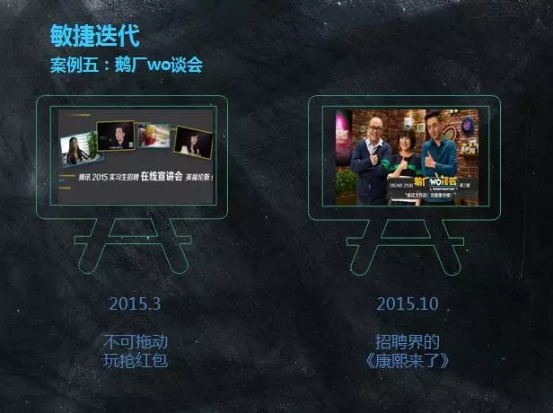 我举两个从数据反馈上还比较不错的两个视频,都是介绍公司是什么样的。底下这个叫做“鹅厂Wo谈会”,另外一个其实就是公司宣传片,我们希望把公司宣传片做成场景式,由一个一个场景堆砌起来,让你感觉这个场景非常真实,这样一个片子两周有100多万的点击,这个效果还是非常好的。