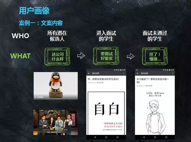 如果面试也结束了,这个时候需要做什么?你的目标用户变成两类人,一类是面试通过的人,然后就是进入入职之前维护的时间,这段时间大家觉得谁出面做事比较好?HR在这个时间应该是退下来的,应该让业务上,这个时候影响同学更有效的就是业务跟他的沟通。HR还能影响一部分什么人?就是面试没有通过的学生,尤其是我们在实习生招聘的时候,没有通过的学生在下半年校园招聘的时候可能还是你的潜在候选人,还是要让他的参与体验是好的。另外这部分人是有风险的,他们没过心里上是很不爽的,他不知道自己是怎么死的,死的也不是很服,有可能会在知乎上给你曝一些负面消息。所以我们要看这些人在这个时间点的诉求是什么?就是我竟然挂了,完全是蒙的状态,要么就是觉得我不服,要么就是觉得“我完了,怎么办”,这个时候可以针对这个群体做一些事情。我们推了另外一篇图文,题目是“实习生面挂了,那就在校招大胜一场”,我们挖掘了一个故事,在实习生面试中失利、潜心学习几个月之后又在校招当中成功的一个人,也是将近3000赞,学生群体中有很好的一个反响。这个就是很简单的一个例子,就是你的用户是谁,他需要什么,在不同的时间段是不一样的。