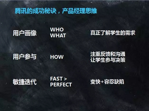 我们所理解的产品思维是包含哪些内容?首先是用户画像,你的用户是谁,长什么样子,以及他想要什么。其次是用户参与,就是在整个产品周期里面,你要更多地让用户参与你的产品开发和产品决策,这样你的产品才是用户喜欢的,就是怎么做产品。第三就是敏捷迭代,整个互联网行业尤其是移动互联网行业都非常强调这件事情,有比没有好,快更重要,它比完美更重要。
