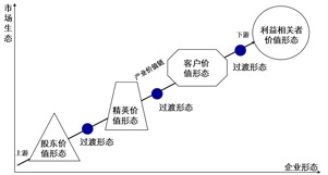 在市场生态中,企业形态沿着产业价值链不断演变,经历了股东价值形态、精英价值形态、客户价值形态、利益相关者价值形态等四种典型组织形态,实现了从低级组织形态向高级组织形态进化,如下图所示。四种企业形态特征分别可以用四种平面图形代表,股东价值形态形如三角形,精英价值形态形如梯形,客户价值形态形如八边形,利益相关者价值形态形如圆形。其中股东价值形态、精英价值形态就是人们常说的“金字塔”形,这也是中国的主流企业形态特征。企业发展“瓶颈”即为企业形态演变的临界点,处于这个阶段需要通过“变形”突破企业发展“瓶颈”。