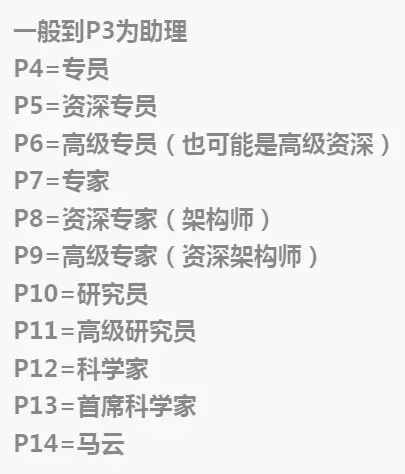 阿里的职称是这么评价的,大部分都归纳在P序列 ,员工的title+工种。比如P7产品经理=产品专家。