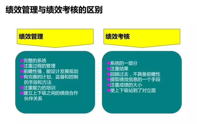在实际的操作过程中,绩效管理可以发现我们员工在能力上的不足和差距。而绩效考核它只注重于成绩的大小,最终我看你成绩是多少,排名是多少,最后得出多少奖金。绩效管理实际上就是我们上下级之间建立一种合作的伙伴关系。而绩效考核就会使上下级站在一种对立面的状况。我想这一点,做过绩效考核的应该有过这种体会,往往你的绩效考核的结果是得不到员工的认同的。但是如果说你真正做到了绩效管理这么一些步骤、一些程序,往往你们之间就是一种合作的关系。