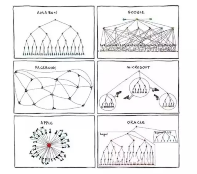 Web设计师Manu Cornet在自己的博客上,画了一组美国科技公司的组织结构图。在他笔下,亚马逊等级森严且有序;谷歌结构清晰,产品和部门之间却相互交错且混乱;Facebook架构分散,就像一张散开的网络;微软内部各自占山为王,军阀作风深入骨髓;苹果一个人说了算,而那个人路人皆知;庞大的甲骨文,臃肿的法务部显然要比工程部门更加重要。