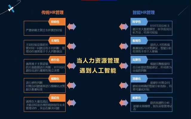 现在我们做传统的人力资源管理的时候,有很多经验性、主观性、碎片化、模糊化和滞后性。在座各位只要是做人力资源的人,一看这几个字就明白了。我的判断这其实就是中医学的早期,完全是靠经验来看病。有了大数据就有了中西医结合的意思,科学性、客观性、完整性、清晰性、前瞻性,有了西医的数据判断,有了多年对病人的了解和对疾病的了解,那个时候准确性和有效性会有很大的提高。当人工智能和大数据时代和HR结合,HR工作的层次就会提升很多,我们所关注的点就会聚焦很多,再也不用关注那么多的模块,只要关注这几件事的解决方案:人物如何脱颖而出、组织如何多元化和灵活、因为思想而产生的文化多么与时俱进、多么跟现代结合,比如硅谷、中关村文化等等,如何跟前面的传统的文化有很大的差异和递进,这就是跟时代接近。