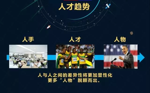 但是新的时代不止拼体力、拼IQ,拼的是你的想法、生意模式、改变格局的实践。所以出来很多创业者,“大众创业、万众创新”其实就是发展人物的重要机制,这就是为什么在硅谷和中关村出现很多独角兽企业。独角兽企业开始的时候就是往“人物”的方向去思考,而不是往人才方向去思考的。正因为这种思考,这些企业内部会出现很多人物,这些企业内部会有很多的创新。比如人工智能现在作为一个全新的思想,在无人驾驶汽车行业、共享经济行业、管理行业,这些行业所有新的趋势都会产生新的创业者,创业者都会变成人物。我在PPT里展示了奥巴马,这是给大家一个感觉,我觉得其实特朗普也算个人物嘛。我们做人力资源的人,或者是对人力资源有兴趣的各位CEO,一定要关注如何让人才脱颖而出变成人物,因为那是真正改变格局的事情,当然也可以关注人手,但是将来智能化的机器就帮你把人手的事情做了。