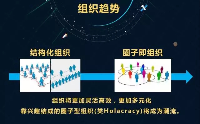 我认为将来的组织要从结构化组织,变成圈子的组织,这跟现在人和人之间的社交模式关系很大。组织是从军队而来的,军队有严格的组织纪律,讲究步调一致,所以组织在过去工业时代和传统的生意时代,是要把人们聚合起来形成统一的一个步调。企业将来的组织形式将和“圈子”有很大的关系,我的观点“圈子即组织”,就是说我们以共同的爱好、共同的理想和共同的信念走到一起,完成一件共同的事情,从而成为人物,或者是一个组织变成一堆人物,这些是人们所崇尚的或者是可能变成的。